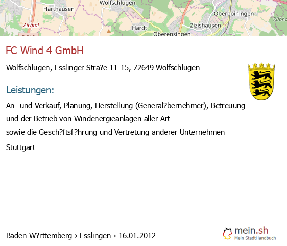 bei Wolfschlugen seit 10/2011Leistungen: An- und Verkauf, Planung, Herstellung (General?bernehmer), Betreuung und Betrieb von Windenergieanlagen aller Art sowie die..