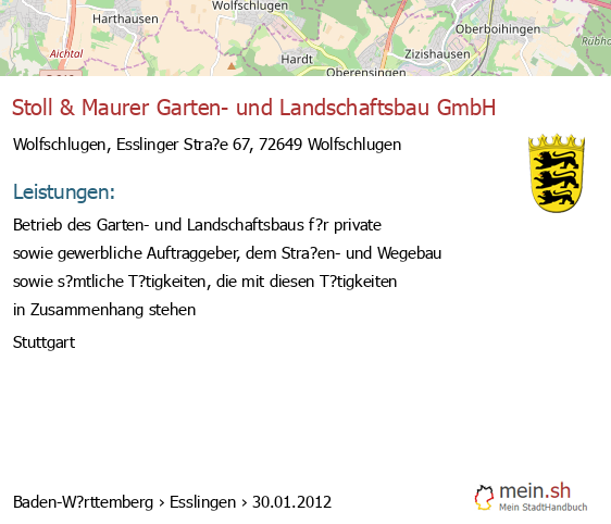 bei Wolfschlugen seit 1/2012Leistungen: Betrieb des Garten- und Landschaftsbaus f?r private sowie gewerbliche Auftraggeber, dem Stra?en- und Wegebau sowie s?mtliche T?tigkeiten, die mit..