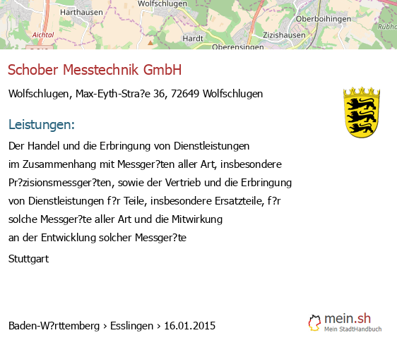 bei Wolfschlugen seit 1/2015Leistungen: Der Handel und die Erbringung von Dienstleistungen im Zusammenhang mit Messger?ten aller Art, insbesondere Pr?zisionsmessger?ten, sowie der Vertrieb und die Erbringung von Dienstleistungen f?r Teile, insbesondere Ersatzteile, f?r solche Messger?te aller Art und..