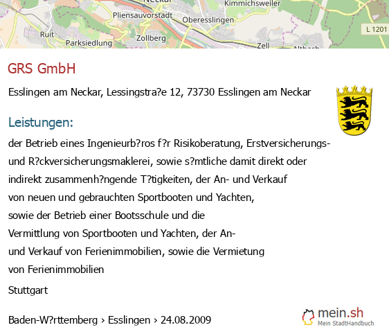 bei Esslingen am Neckar seit 8/2009Leistungen: der Betrieb eines Ingenieurb?ros f?r Risikoberatung, Erstversicherungs- und R?ckversicherungsmaklerei, sowie s?mtliche damit direkt oder indirekt zusammenh?ngende T?tigkeiten, der An- und Verkauf von neuen und gebrauchten Sportbooten und Yachten, sowie der Betrieb einer Bootsschule und..