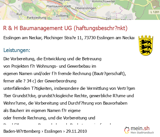 bei Esslingen am Neckar seit 1/2010Leistungen: der Hoch- und Tiefbau, der Abbruch von Geb?uden und die Durchf?hrung von Erdarbeiten und Entr?mpelungen.