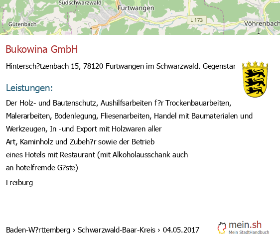 bei Furtwangen im Schwarzwald seit 5/2017Leistungen: Der Holz- und Bautenschutz, Aushilfsarbeiten f?r Trockenbauarbeiten, Malerarbeiten, Bodenlegung, Fliesenarbeiten, Handel mit Baumaterialen und Werkzeugen, In -und Export mit Holzwaren aller Art, Kaminholz und Zubeh?r sowie der Betrieb..