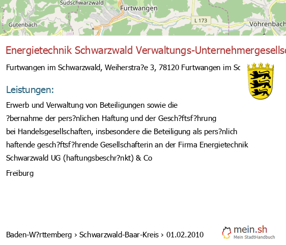 bei Furtwangen im Schwarzwald seit 2/2010Leistungen: Erwerb und Verwaltung von Beteiligungen sowie die ?bernahme der pers?nlichen Haftung und der Gesch?ftsf?hrung bei Handelsgesellschaften, insbesondere die Beteiligung als pers?nlich haftende gesch?ftsf?hrende Gesellschafterin an der Firma Energietechnik Schwarzwald UG (haftungsbeschr?nkt) & Co..
