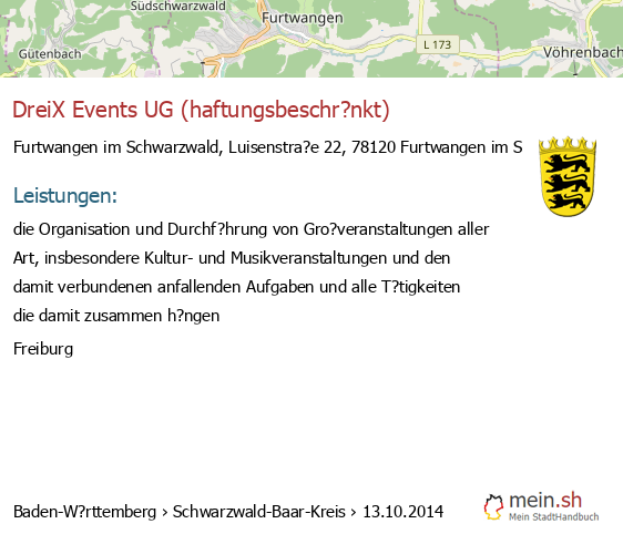 bei Furtwangen im Schwarzwald seit 10/2014Leistungen: die Organisation und Durchf?hrung von Gro?veranstaltungen aller Art, insbesondere Kultur- und Musikveranstaltungen und den damit verbundenen anfallenden Aufgaben und alle T?tigkeiten die damit zusammen h?ngen..