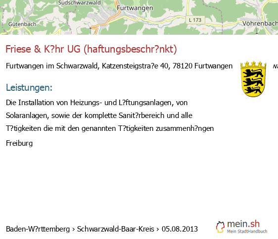 bei Furtwangen im Schwarzwald seit 4/2011Reibschenhofweg 13, 78120 Furtwangen im Schwarzwald. Gegenstand ge?ndert