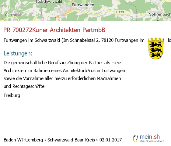 bei Furtwangen im Schwarzwald seit 1/2017Leistungen: Die gemeinschaftliche Berufsaus?bung der Partner als Freie Architekten im Rahmen eines Architekturb?ros in Furtwangen sowie die Vornahme aller hierzu erforderlichen Ma?nahmen und Rechtsgesch?fte..