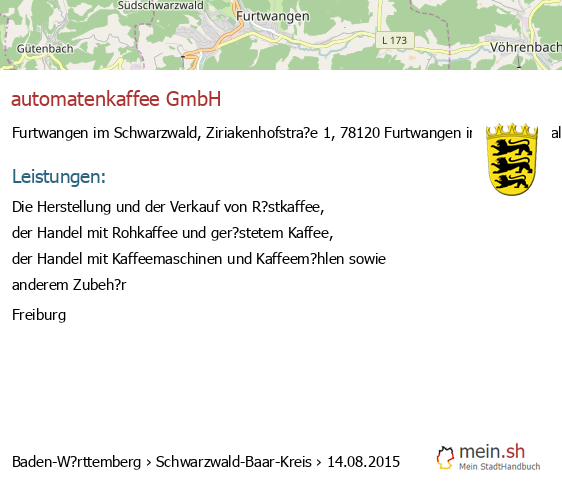 bei Furtwangen im Schwarzwald seit 8/2015Leistungen: Die Herstellung und der Verkauf von R?stkaffee, der Handel mit Rohkaffee und ger?stetem Kaffee, der Handel mit Kaffeemaschinen und..