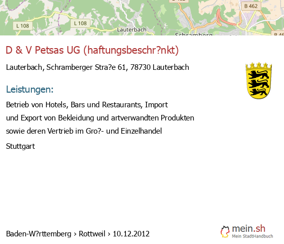 bei Lauterbach seit 12/2012Leistungen: Betrieb von Hotels, Bars und Restaurants, Import und Export von Bekleidung und artverwandten Produkten sowie..