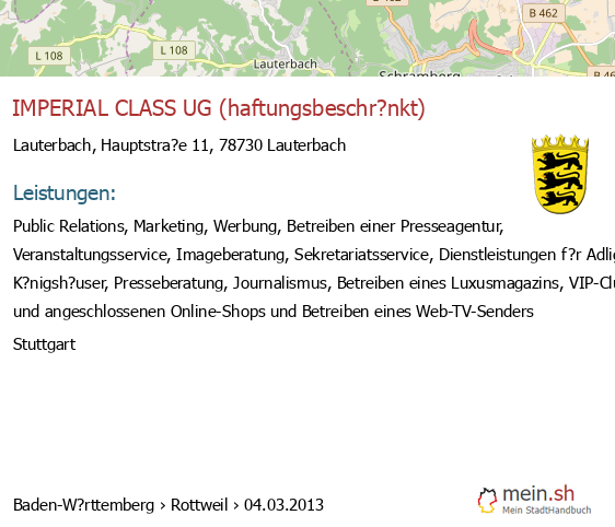 bei Lauterbach seit 3/2013Leistungen: Public Relations, Marketing, Werbung, Betreiben einer Presseagentur, Veranstaltungsservice, Imageberatung, Sekretariatsservice, Dienstleistungen f?r Adlige und K?nigsh?user, Presseberatung, Journalismus, Betreiben eines Luxusmagazins, VIP-Clubs und angeschlossenen Online-Shops und Betreiben eines Web-TV-Senders..