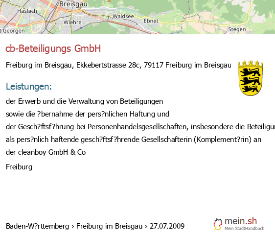 Die Informationen dieser Seite über Freiburg im Breisgau in Baden-W?rttemberg wurden durch uns mit Recherche öffentlicher Kreisfreie Stadt Freiburg im Breisgau Quellen erstellt, und können fehlerbehaftet oder veraltet sein. Für Öffnungszeiten schauen Sie bitte auf die Seite der Freiburg im Breisgauer Anbieter. Für den Gesellschafter, die Bilanz, den Jahresabschluss, Umsatz und Gewinn empfehlen wir, den Bundesanzeiger zu nutzen. Wenn 79117 Freiburg im Breisgau Einträge aktualisiert oder entfernt werden müssen, geben Sie uns bitte einen Hinweis.