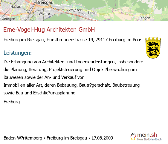 bei Freiburg im Breisgau seit 8/2009Leistungen: Die Erbringung von Architekten- und Ingenieurleistungen, insbesondere die Planung, Beratung, Projektsteuerung und Objekt?berwachung im Bauwesen sowie der An- und Verkauf von Immobilien aller..