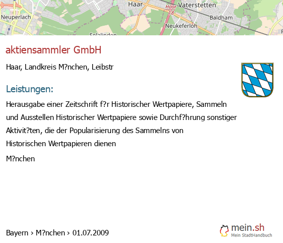 Die Informationen dieser Seite über Haar in Bayern wurden durch uns mit Recherche öffentlicher Landkreis M?nchen Quellen erstellt, und können fehlerbehaftet oder veraltet sein. Für Öffnungszeiten schauen Sie bitte auf die Seite der Haarer Anbieter. Für den Gesellschafter, die Bilanz, den Jahresabschluss, Umsatz und Gewinn empfehlen wir, den Bundesanzeiger zu nutzen. Wenn 85540 Haar Einträge aktualisiert oder entfernt werden müssen, geben Sie uns bitte einen Hinweis.