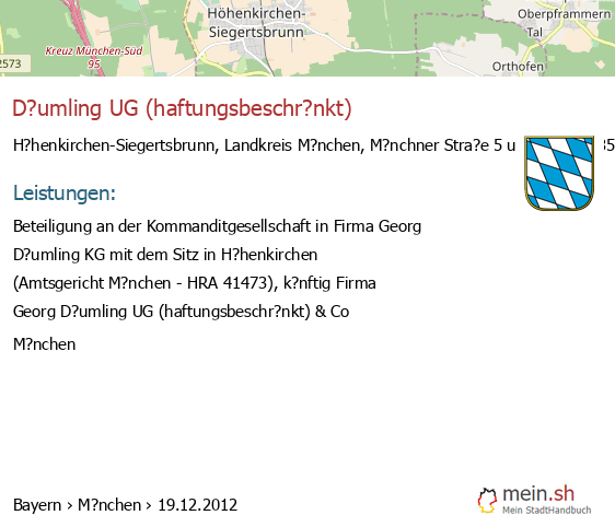 bei H?henkirchen-Siegertsbrunn seit 2/2011Leistungen: Beteiligung an Unternehmen und Beratung von Unternehmen und Einzelpersonen, insbesondere zur Restrukturierung und zum..