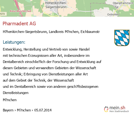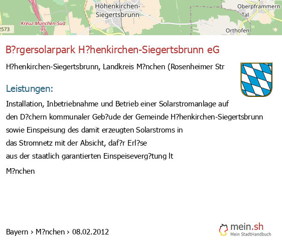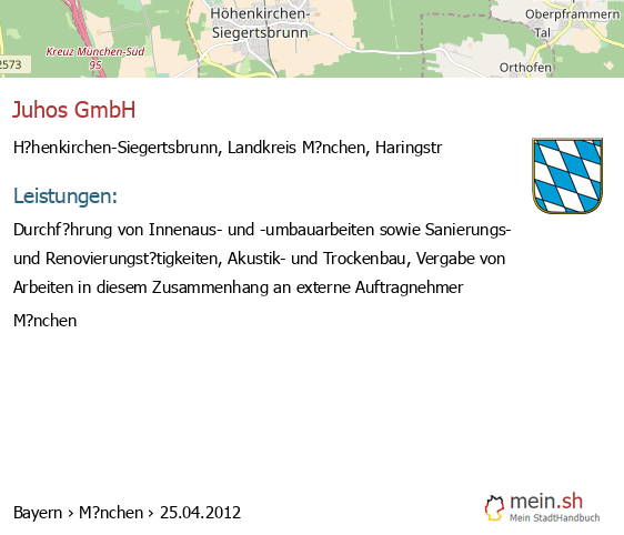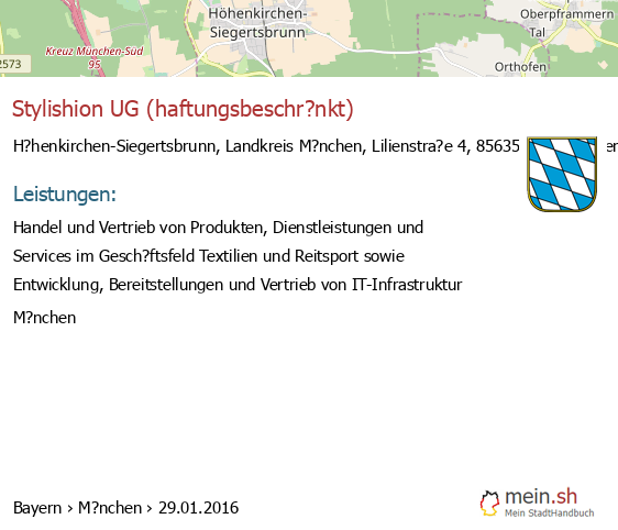 Die Informationen dieser Seite über H?henkirchen-Siegertsbrunn in Bayern wurden durch uns mit Recherche öffentlicher Landkreis M?nchen Quellen erstellt, und können fehlerbehaftet oder veraltet sein. Für Öffnungszeiten schauen Sie bitte auf die Seite der H?henkirchen-Siegertsbrunner Anbieter. Für den Gesellschafter, die Bilanz, den Jahresabschluss, Umsatz und Gewinn empfehlen wir, den Bundesanzeiger zu nutzen. Wenn 85635 H?henkirchen-Siegertsbrunn Einträge aktualisiert oder entfernt werden müssen, geben Sie uns bitte einen Hinweis.