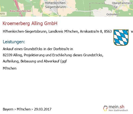 bei H?henkirchen-Siegertsbrunn seit 3/2017Leistungen: Ankauf eines Grundst?cks in der Dorfstra?e in 82339 Alling, Projektierung und Erschlie?ung dieses Grundst?cks..