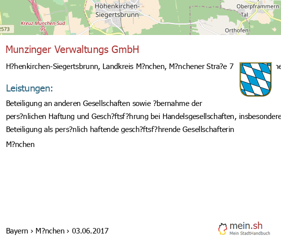 bei H?henkirchen-Siegertsbrunn seit 2/2017Leistungen: Beratung in allen Fragen der Unternehmensf?hrung, Vermittlung von Kapital und Immobilien sowie Erbringung von Personaldienstleistungen..