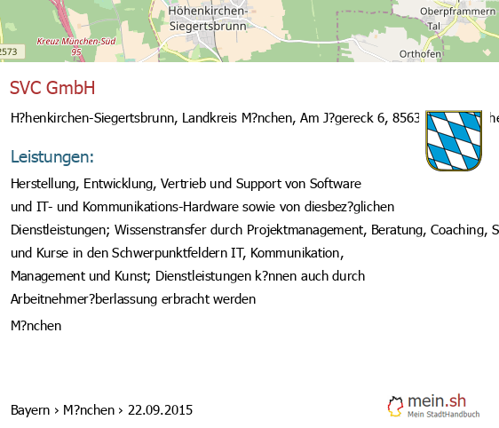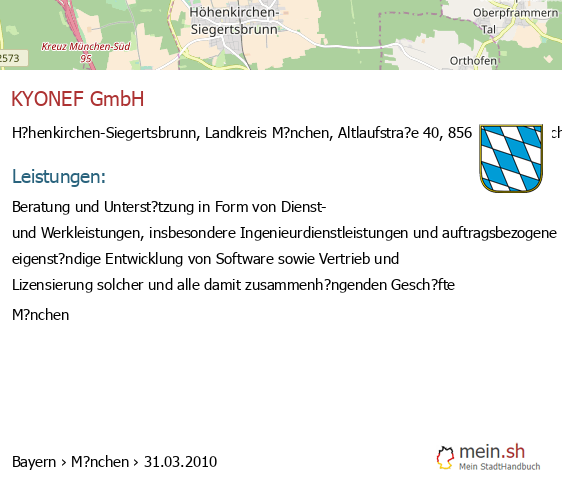 bei H?henkirchen-Siegertsbrunn seit 3/2010Leistungen: Beratung und Unterst?tzung in Form von Dienst- und Werkleistungen, insbesondere Ingenieurdienstleistungen und auftragsbezogene und eigenst?ndige Entwicklung von Software sowie Vertrieb und Lizensierung solcher und..