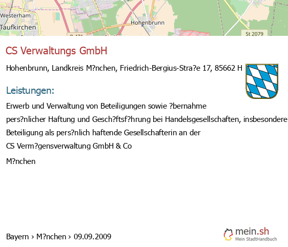 bei Hohenbrunn seit 9/2009Leistungen: Erwerb und Verwaltung von Beteiligungen sowie ?bernahme pers?nlicher Haftung und Gesch?ftsf?hrung bei Handelsgesellschaften, insbesondere Beteiligung als pers?nlich haftende Gesellschafterin an der CS Verm?gensverwaltung GmbH & Co..