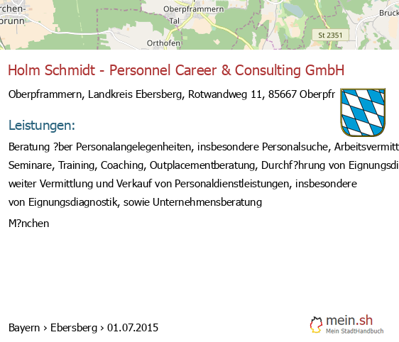 bei Oberpframmern seit 7/2015Leistungen: Beratung ?ber Personalangelegenheiten, insbesondere Personalsuche, Arbeitsvermittlung, Personalentwicklung, Seminare, Training, Coaching, Outplacementberatung, Durchf?hrung von Eignungsdiagnostik; weiter Vermittlung und Verkauf von Personaldienstleistungen, insbesondere von Eignungsdiagnostik, sowie..