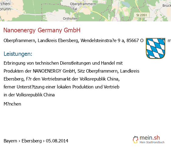 bei Oberpframmern seit 8/2014Leistungen: Erbringung von technischen Dienstleitungen und Handel mit Produkten der NANOENERGY GmbH, Sitz Oberpframmern, Landkreis Ebersberg, f?r den Vertriebsmarkt der Volksrepublik China, ferner Unterst?tzung einer lokalen Produktion und Vertrieb in der..
