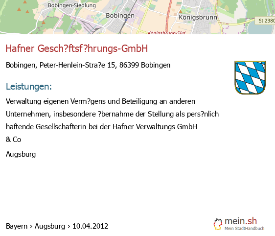bei Bobingen seit 8/2010Leistungen: Verwaltung eigenen Verm?gens einschlie?lich des Erwerbs und der Verwaltung von Beteiligungen sowie die ?bernahme der pers?nlichen Haftung und der Gesch?ftsf?hrung bei Handelsgesellschaften.