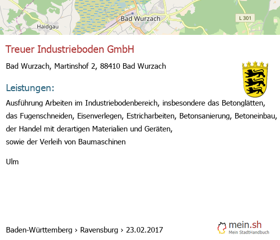 bei Bad Wurzach seit 2/2017Leistungen: Die Herstellung und der Vertrieb von Waren sowie die Erbringung von Dienstleistungen im Bezug auf Betontechnik, insbesondere der Betonglättung, der weiteren Bearbeitung und der Veredelung von Betonböden, der Betrieb einer Werbeagentur und damit verbundene Geschäfte..