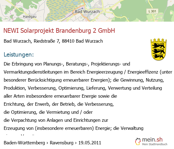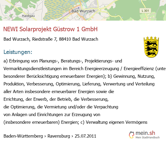 bei Bad Wurzach seit 7/2011Leistungen: a) Erbringung von Planungs-, Beratungs-, Projektierungs- und Vermarktungsdienstleistungen im Bereich Energieerzeugung / Energieeffizienz (unter besonderer Berücksichtigung erneuerbarer Energien); b) Gewinnung, Nutzung, Produktion, Verbesserung, Optimierung, Lieferung, Verwertung und Verteilung aller Arten insbesondere erneuerbarer Energien sowie die Errichtung, der Erwerb, der Betrieb, die Verbesserung..