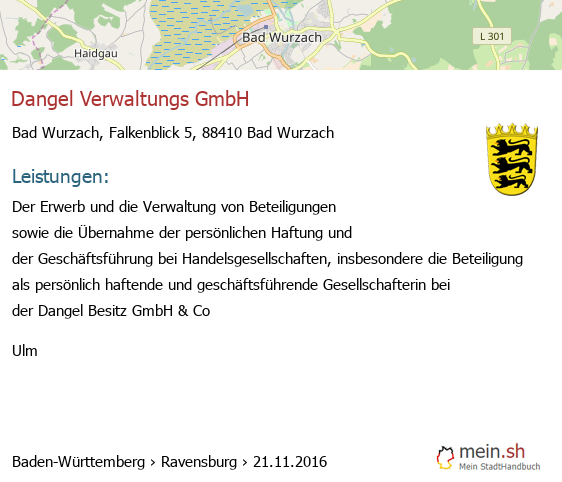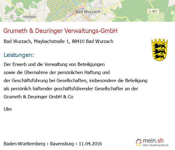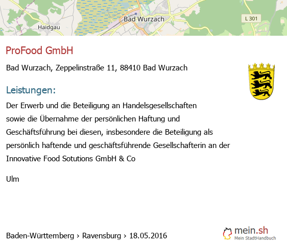 bei Bad Wurzach seit 11/2016Leistungen: Der Erwerb und die Verwaltung von Beteiligungen sowie die Übernahme der persönlichen Haftung und der Geschäftsführung bei Handelsgesellschaften, insbesondere die Beteiligung als persönlich..