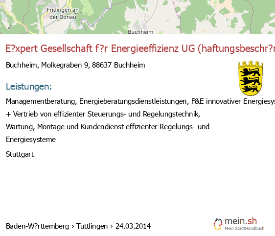 bei Leibertingen seit 3/2014Leistungen: Managementberatung, Energieberatungsdienstleistungen, F&E innovativer Energiesysteme, Seminare/Vorlesungst?tigkeiten, Entwicklung + Vertrieb von effizienter Steuerungs- und Regelungstechnik, Wartung, Montage und Kundendienst effizienter..