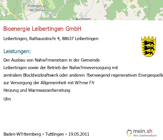 bei Leibertingen seit 5/2011Leistungen: Der Ausbau von Nahw?rmenetzen in der Gemeinde Leibertingen sowie der Betrieb der Nahw?rmeversorgung mit zentralem Blockheizkraftwerk oder anderen ?berwiegend regenerativen Energiequellen zur Versorgung..