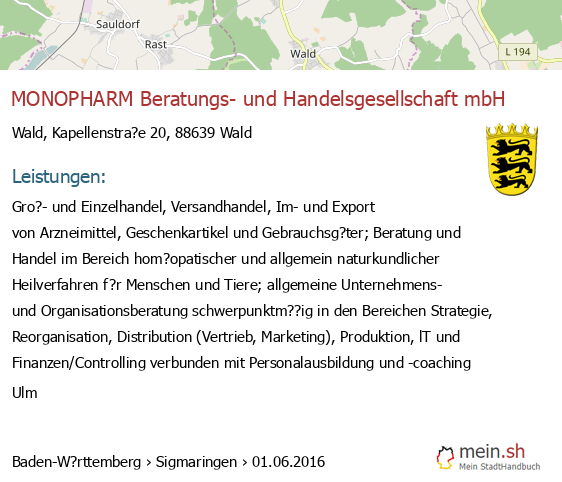 bei Wald seit 6/2016Leistungen: Gro?- und Einzelhandel, Versandhandel, Im- und Export von Arzneimittel, Geschenkartikel und Gebrauchsg?ter; Beratung und Handel im Bereich hom?opatischer und allgemein naturkundlicher Heilverfahren f?r Menschen und Tiere; allgemeine Unternehmens- und Organisationsberatung schwerpunktm??ig in den Bereichen Strategie, Reorganisation, Distribution (Vertrieb, Marketing), Produktion, lT und Finanzen/Controlling verbunden mit Personalausbildung und..