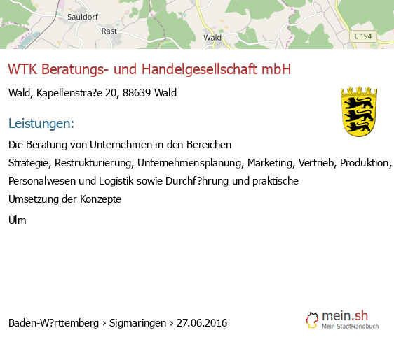 Die Informationen dieser Seite über Wald in Baden-W?rttemberg wurden durch uns mit Recherche öffentlicher Landkreis Sigmaringen Quellen erstellt, und können fehlerbehaftet oder veraltet sein. Für Öffnungszeiten schauen Sie bitte auf die Seite der Walder Anbieter. Für den Gesellschafter, die Bilanz, den Jahresabschluss, Umsatz und Gewinn empfehlen wir, den Bundesanzeiger zu nutzen. Wenn 88639 Wald Einträge aktualisiert oder entfernt werden müssen, geben Sie uns bitte einen Hinweis.